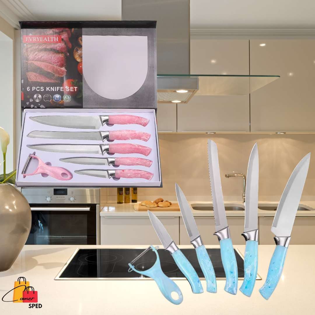 馃泹Colores disponibles: Azul y rosa. 馃泹Contiene 6 pzas: 5 Cuchillos y un pelador.