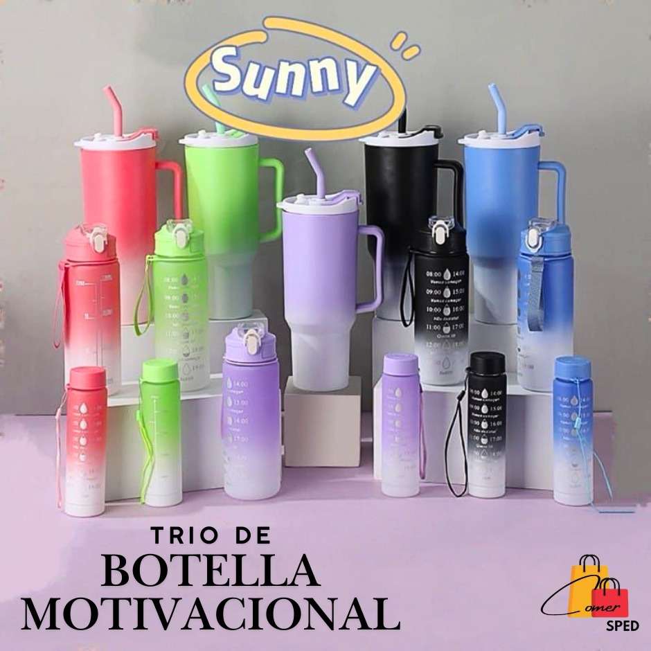 Incluye 2 botellas (900 ml y 300 ml) Incluye 1 termo de 1200 ml Incluye tapas y popotes
